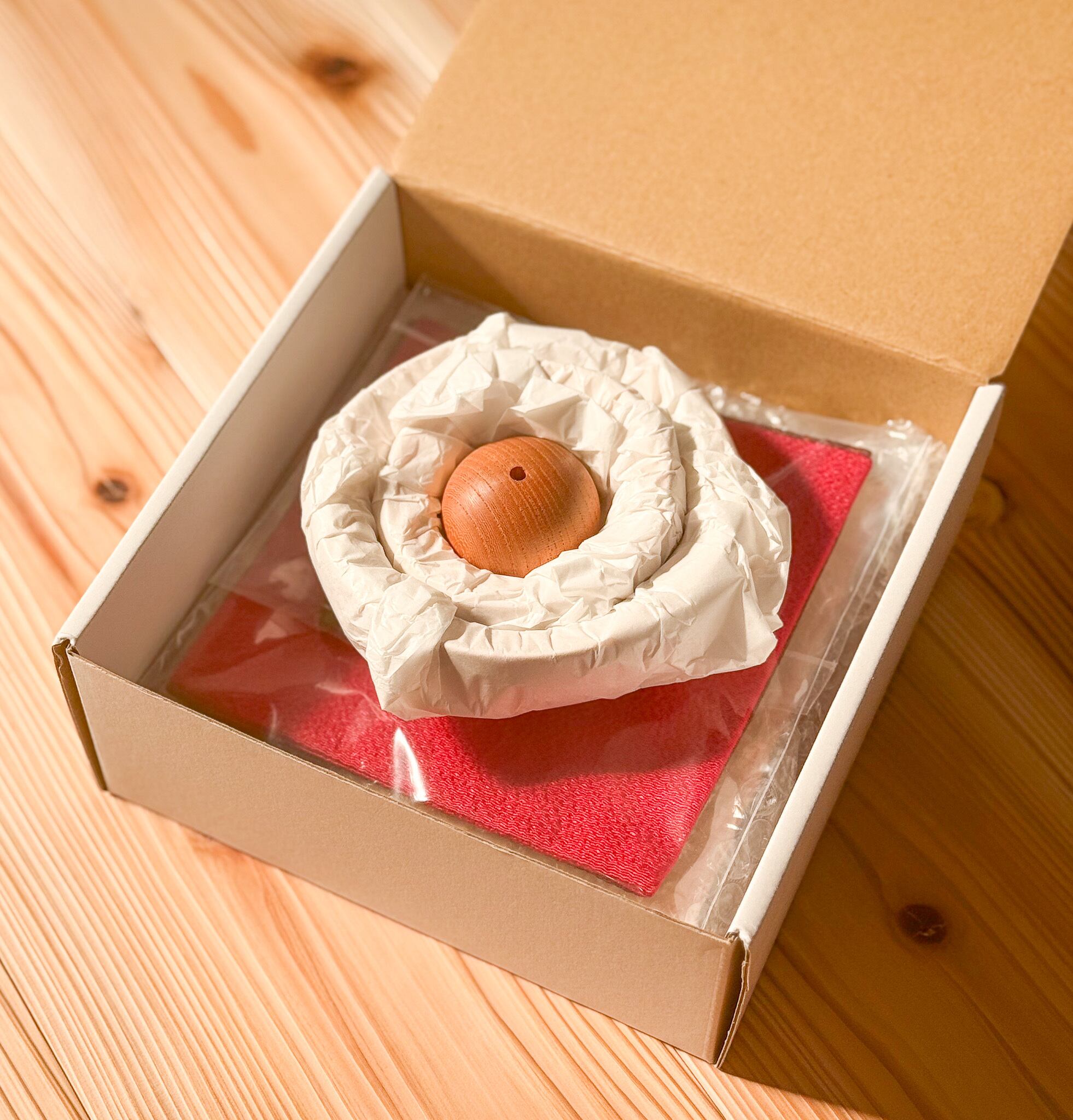 国産ケヤキ材の橙(つまみ細工の葉付き)、敷布(赤・焦茶の2色から選択可能)、
