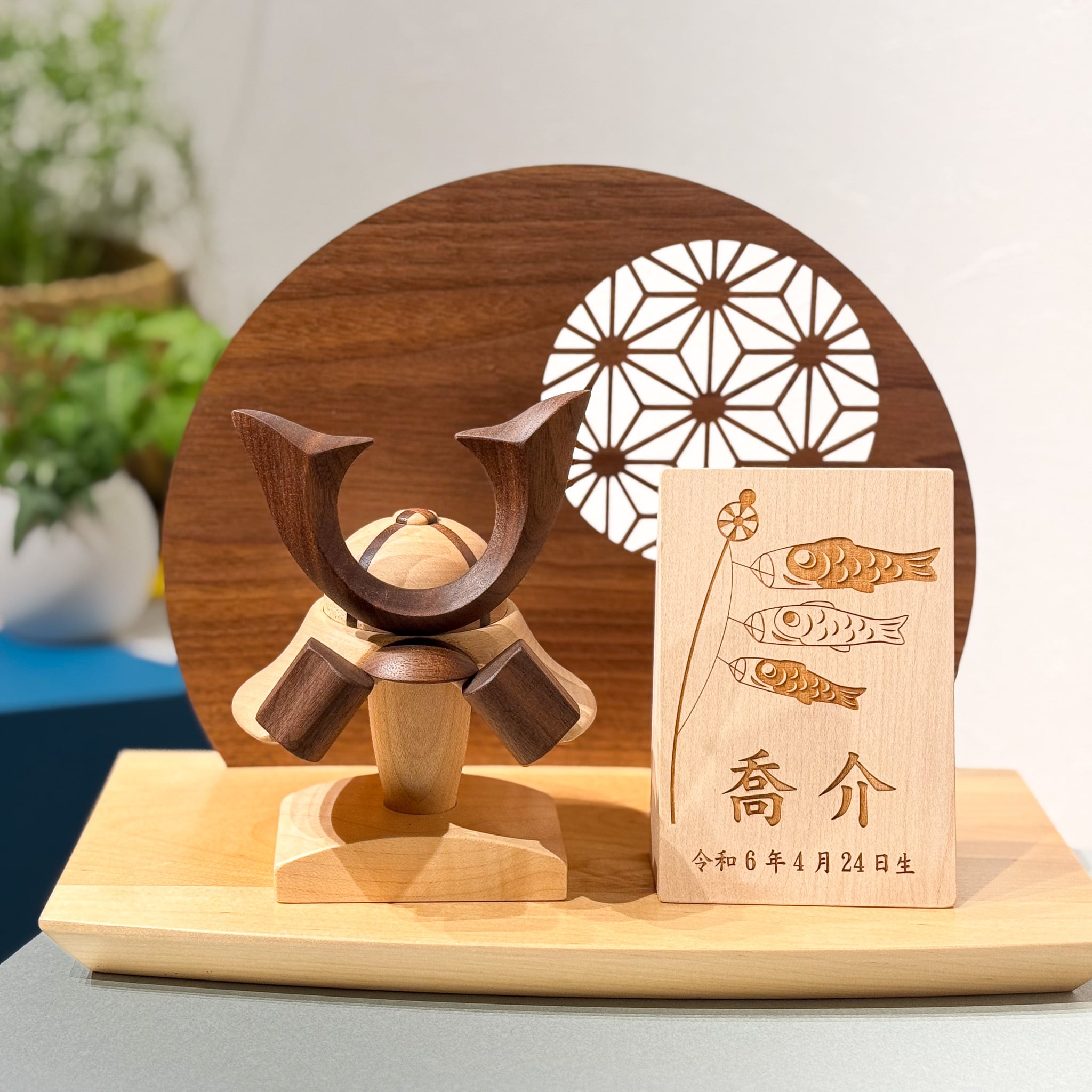 節句飾りをぐっと豪華に演出できる飾り台「ウッドステージ」とお子様のお名前と生年月日が彫り込まれた名札もご用意しました
